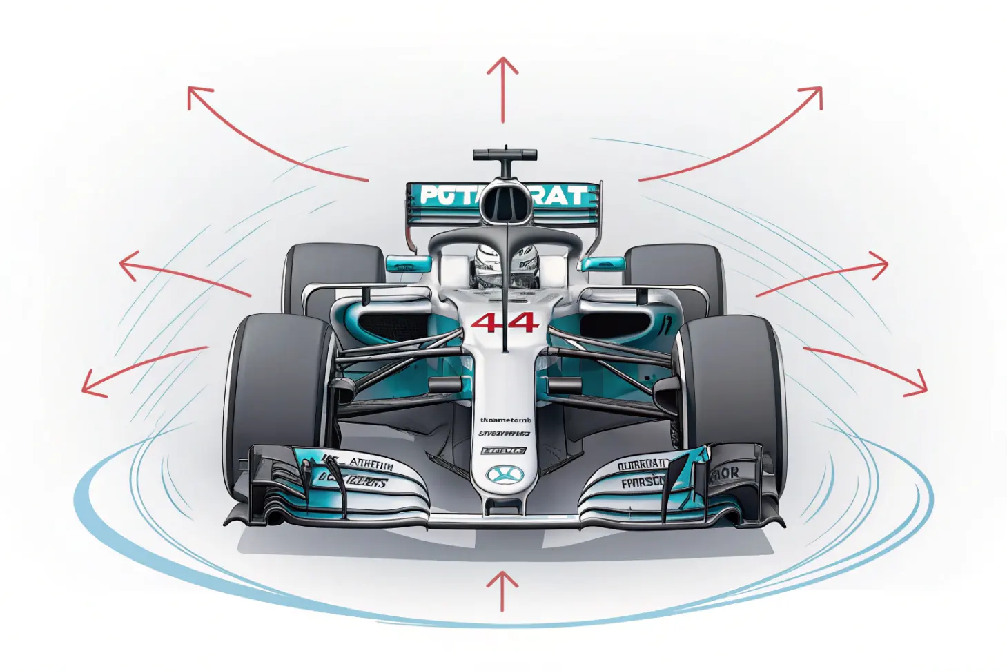 Аэродинамика определяет, насколько быстро болид может разгоняться, тормозить и проходить повороты. Главная цель — заставить воздух работать на скорость и стабильность автомобиля. Когда болид движется, воздушный поток делится на верхний и нижний, при этом инженеры стремятся к тому, чтобы поток под днищем шёл быстрее, создавая зону пониженного давления. Чем больше разница давления сверху и снизу, тем сильнее машина «прижимается» к асфальту. Это явление называют прижимной силой, и без неё прохождение быстрых поворотов было бы невозможным.